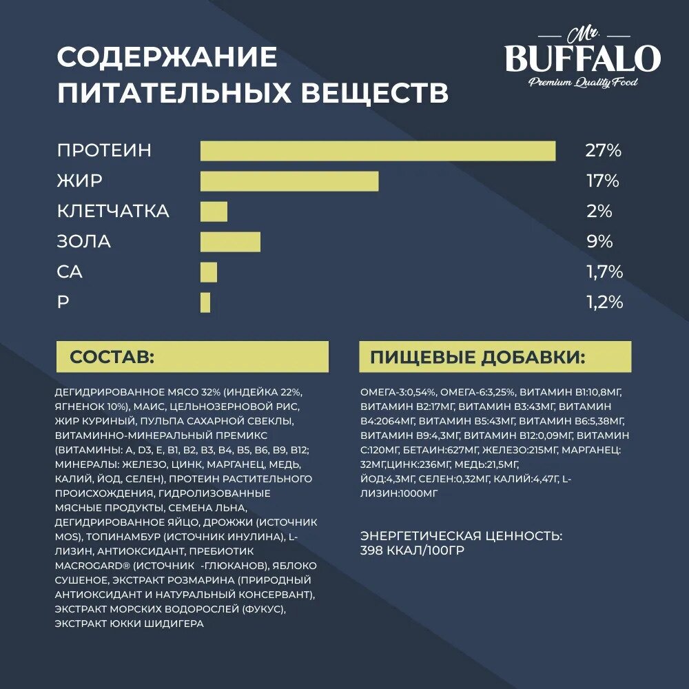 | Состав | дегидрированное мясо 32% (индейка 22%, ягненок 10%), маис, цельнозерновой рис, жир куриный, пульпа сахарной свеклы, витаминно-минеральный премикс (витамины: А, D3, E, B1, В2, В3, B4, B5, B6, B9, B12; минералы: железо, цинк, марганец, медь, калий, йод, селен), протеин растительного происхождения, гидролизованные мясные продукты, семена льна, дегидрированное яйцо, дрожжи (источник MOS), топинамбур (источник инулина), L-лизин, антиоксидант, пребиотик MacroGard® (источник β-глюканов), яблоко сушеное, экстракт розмарина (природный антиоксидант и натуральный консервант), экстракт морских водорослей (фукус), экстракт Юкки Шидигера. |
