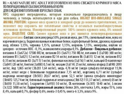 | Состав | свежая курица 50%, рисовая мука, рис 11%, мякоть свеклы, мука из коричневого риса, животный белок гидролизованный, протеин картофеля, дрожжи, куриный жир, яблоко 1,15%, клюква 1,15%, шпинат 1,15%, морковь 1,15%, минеральные вещества, инулин из цикория-источник ФОС-0,1%, маннана-олигосахариды 0,1% |