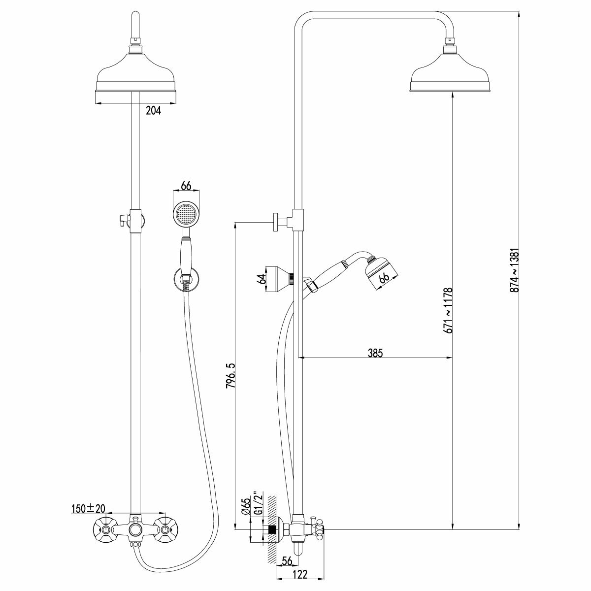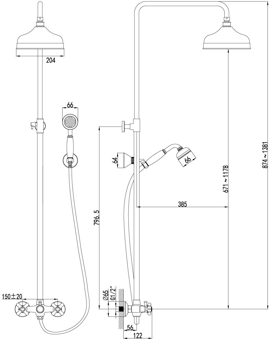 | Дополнительная информация | высота стойки для душа: 1315 мм; диаметр душевой лейки: 66 мм; диаметр верхнего душа: 204 мм |