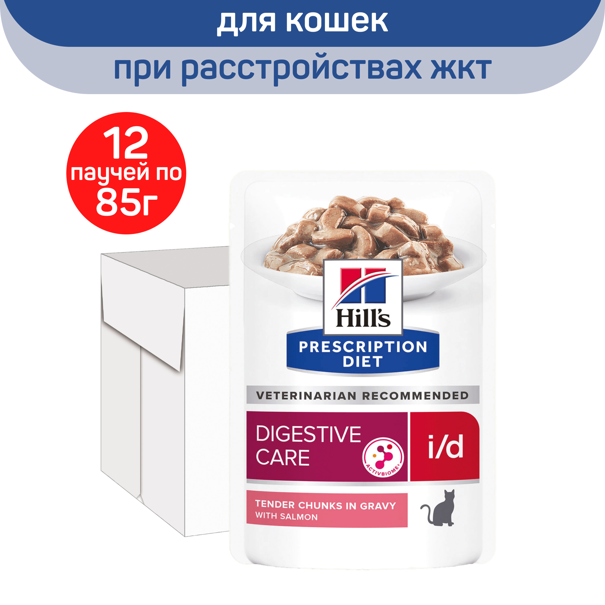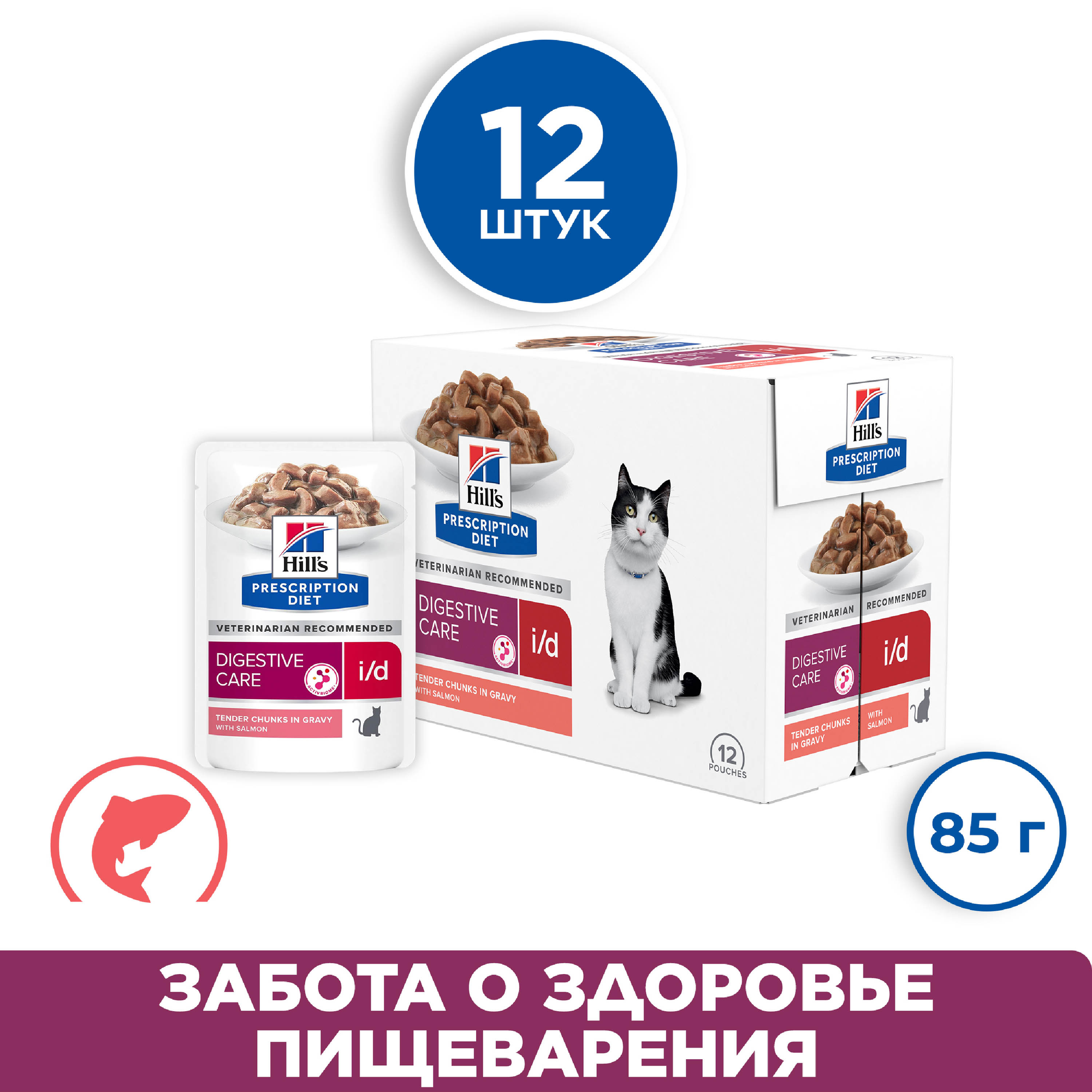 Влажный корм для кошек Hill's Prescription Diet i/d Digestive Care при заболеваниях ЖКТ,кусочки в соусе,с лососем,упаковка 12 шт х 85 гр 606409