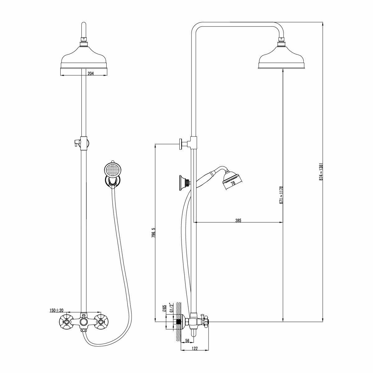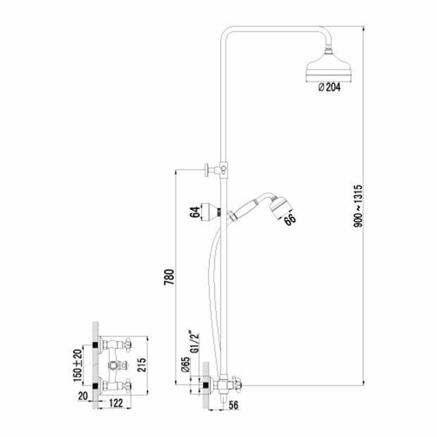 | Дополнительная информация | высота стойки для душа: 1315 мм; диаметр душевой лейки: 66 мм; диаметр верхнего душа: 204 мм |