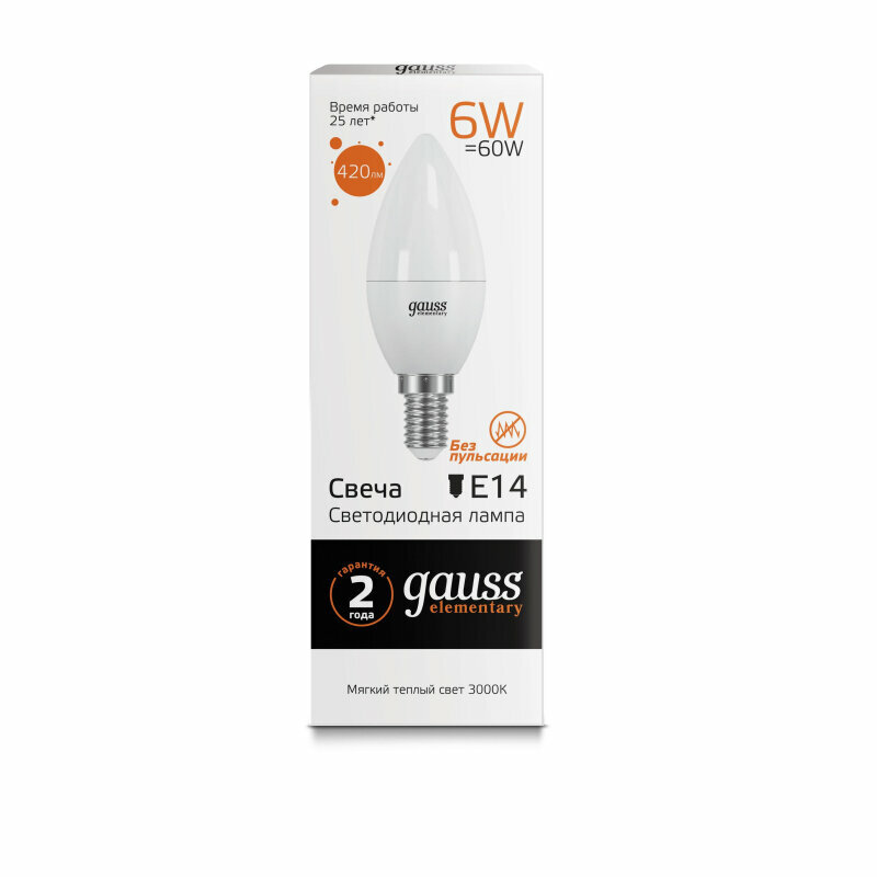 Лампа светодиодная gauss Elementary 33116, E14, C37, 6 Вт, 3000 К