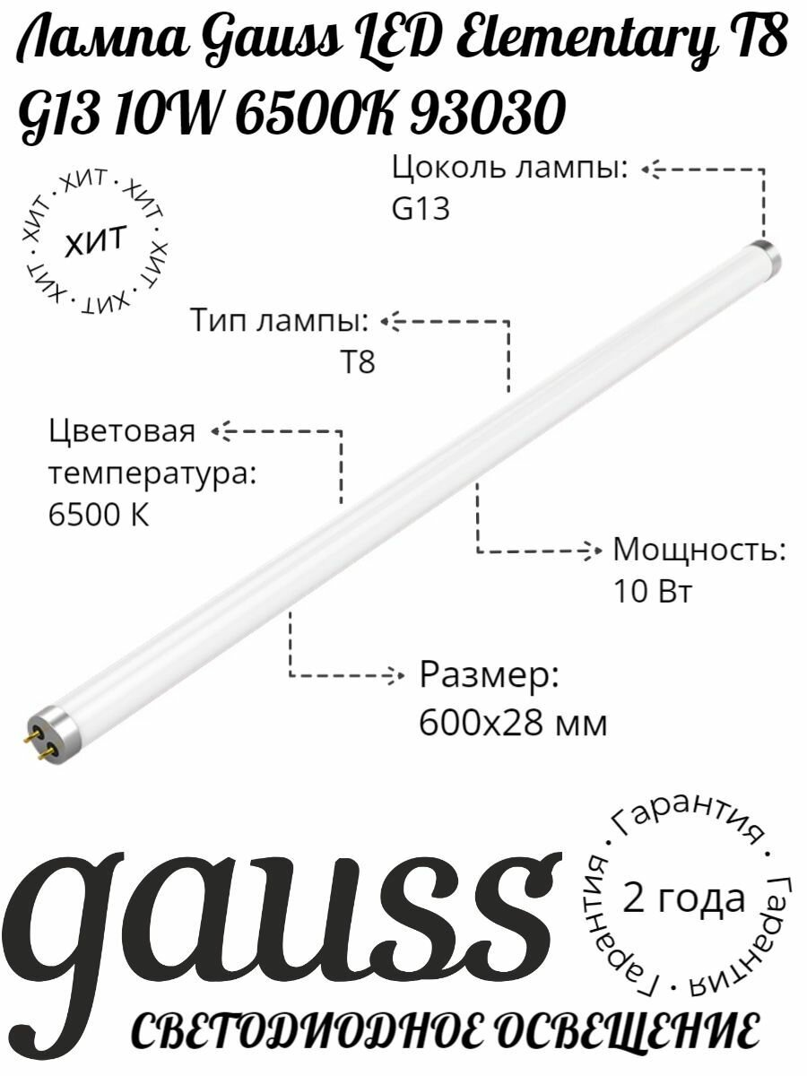 Лампа светодиодная gauss Elementary 93030, G13, T8, 10 Вт, 6500 К