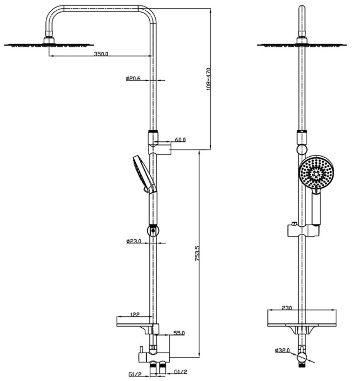 | Дополнительная информация | телескопическая стойка, шарнирное крепление верхнего душа; диаметр душевой лейки: 118 мм; диаметр верхнего душа: 300 мм; количество форсунок лейки: 132 - верхняя лейка, 89 - ручная лейка |