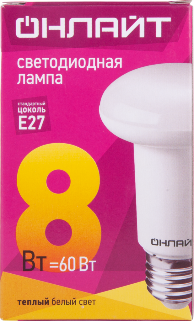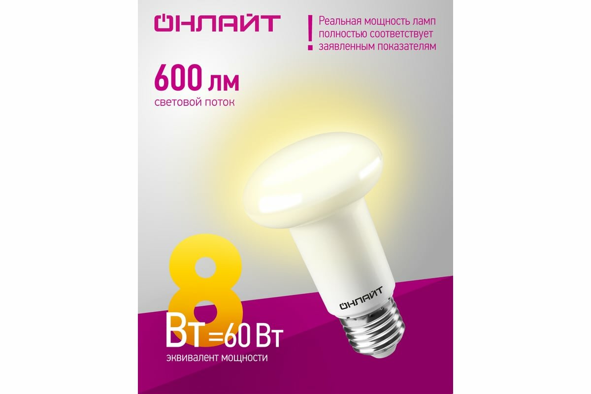 Лампа светодиодная онлайт 71653, E27, R63, 8 Вт, 2700 К. Упаковка 10 штук.