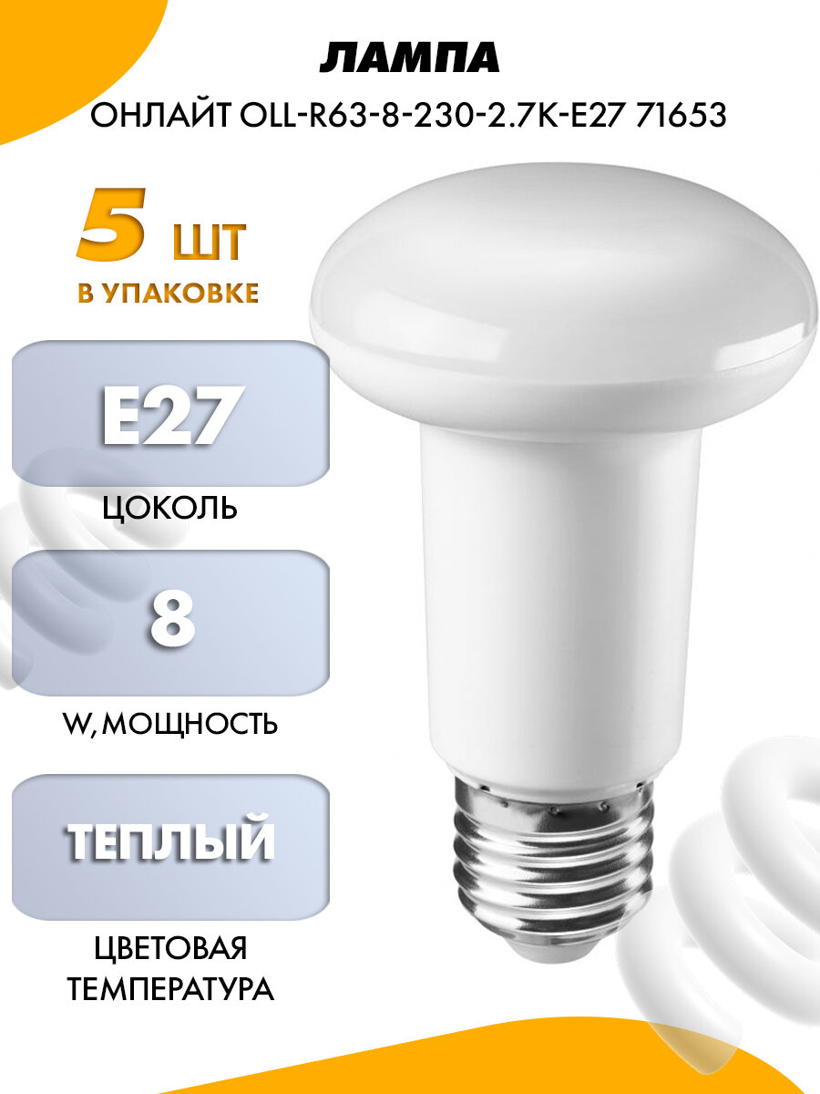 Комплект 5 штук, Лампа светодиодная онлайт OLL-R63-8-230-2.7K-E27 8Вт E27 2700К 71653