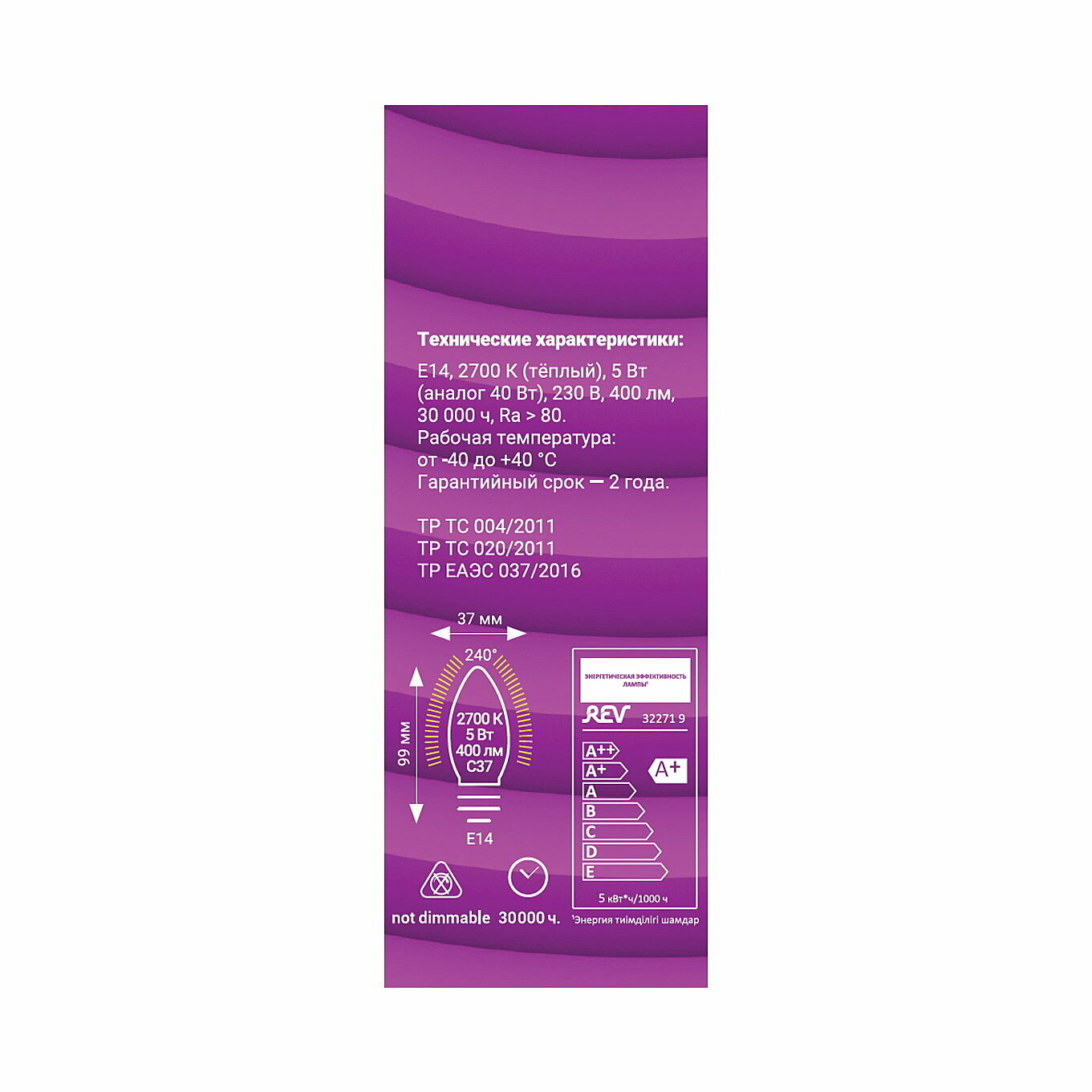 Лампа светодиодная E14 5W C37 2700K, теплый свет, REV