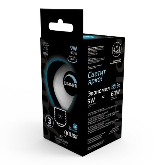 Купить Светодиодная лампа Gauss Filament Шар 9W 610lm 4100К Е27 milky диммируемая LED 1/10/50