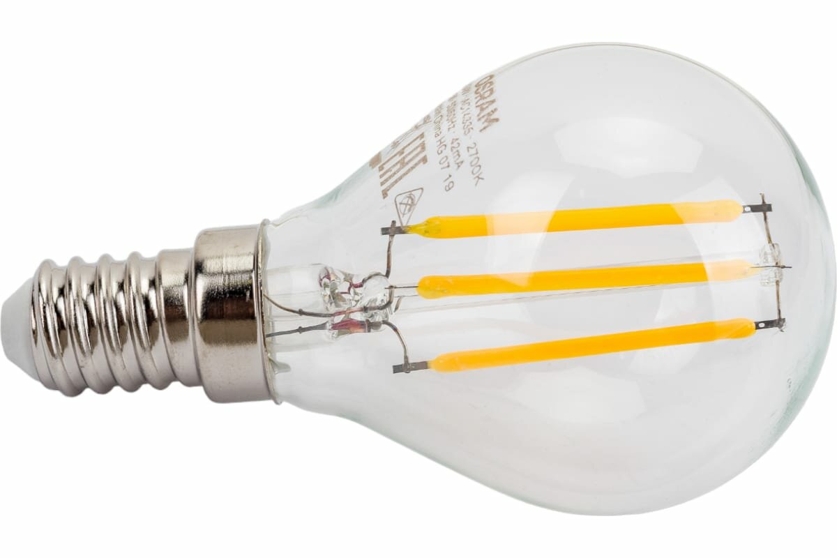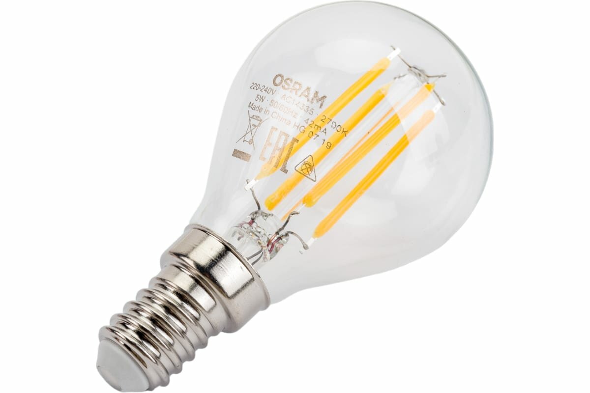 Лампа OSRAM LED Star E14 шар P (G45) 5Вт, филаментная, светодиодная LED, 600 лм, эквивалент 60Вт, тёплый свет 2700К