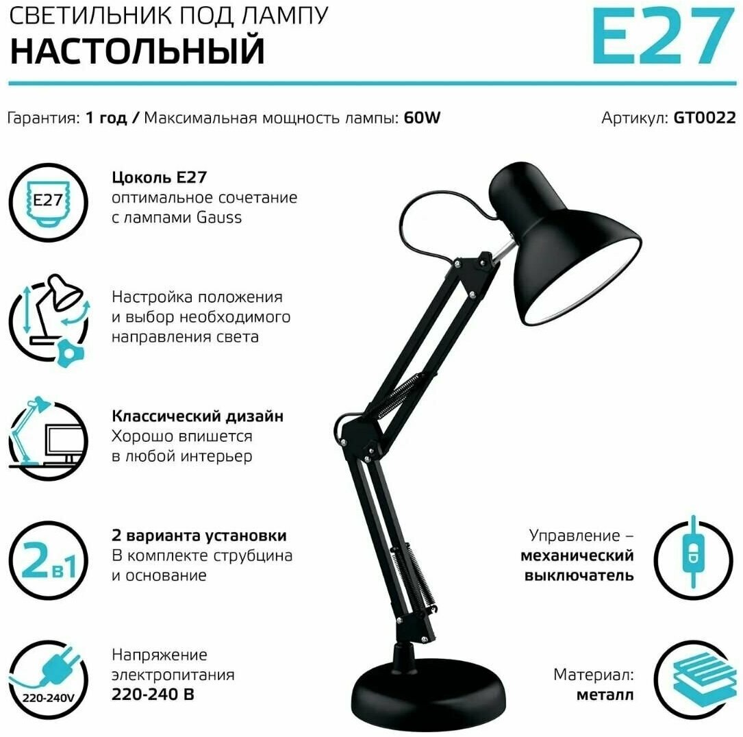 Светильник Gauss GTL002, 60W 220-240V E27 черный струбцина и основание