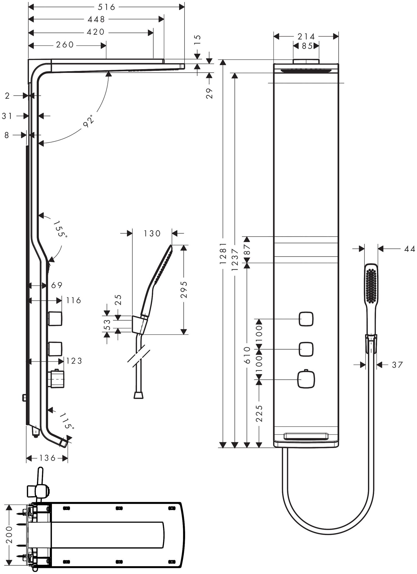 | Дополнительная информация | длина душевой панели: 1281 мм; длина верхнего душа: 516 мм; ширина верхнего душа: 214 мм |