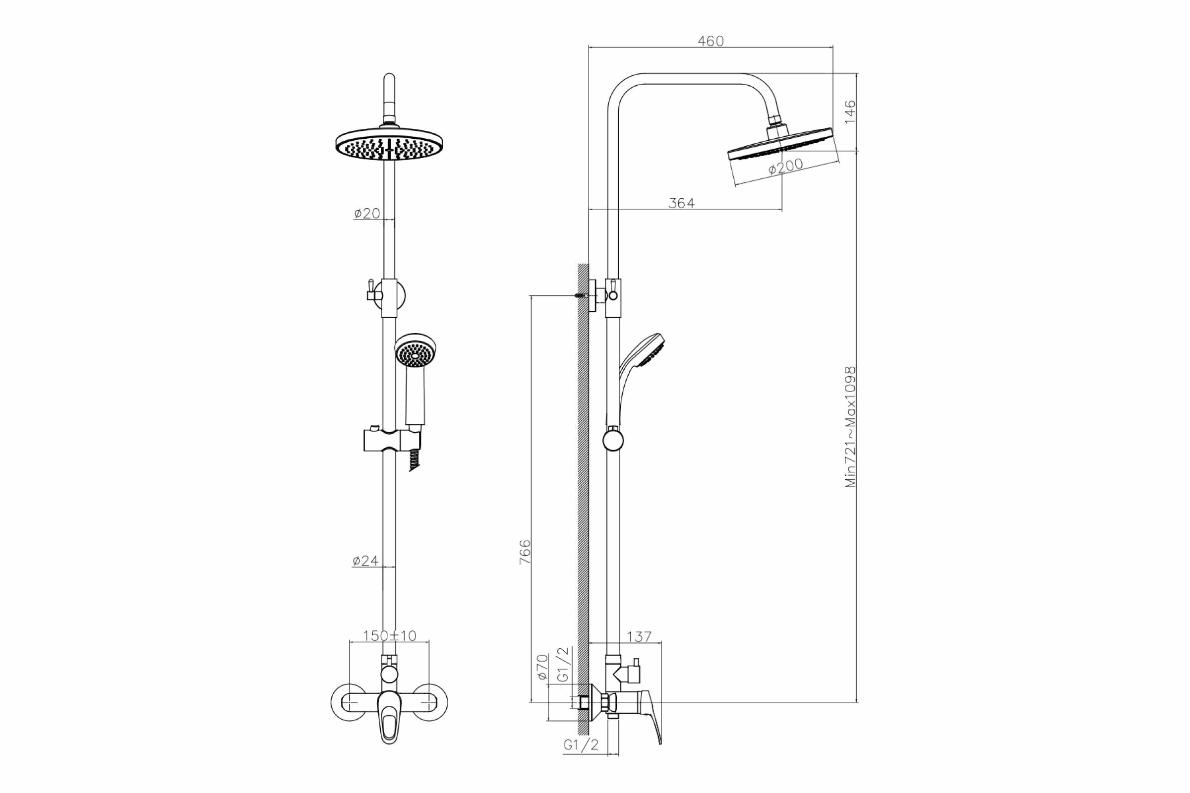 Смеситель DECOROOM DR21070 для душа с регулируемой высотой штанги и верхней душевой лейкой "Тропический дождь"