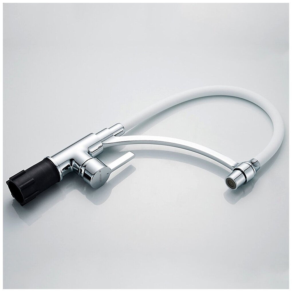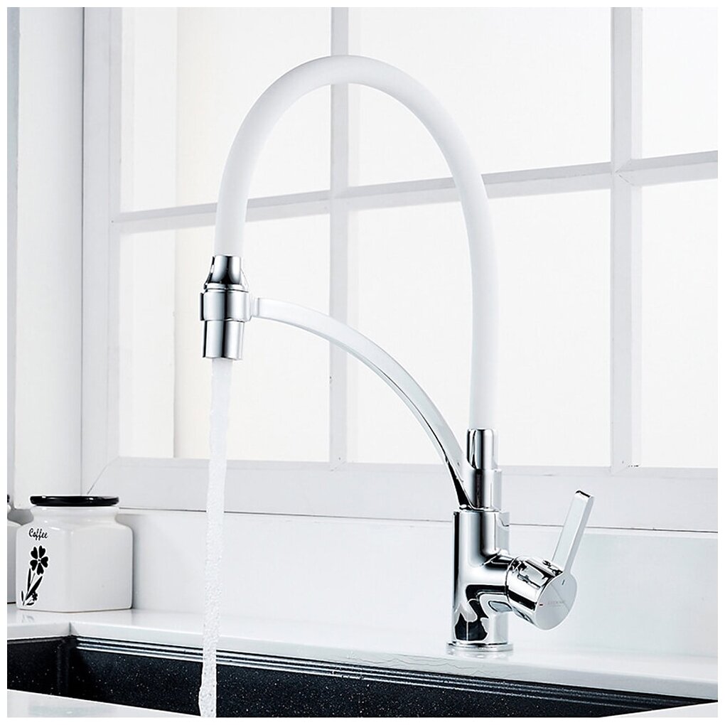 Однорычажный смеситель для кухни с гибким силиконовым и поворотным изливом Ledeme L4499-3 белый/хром, латунь