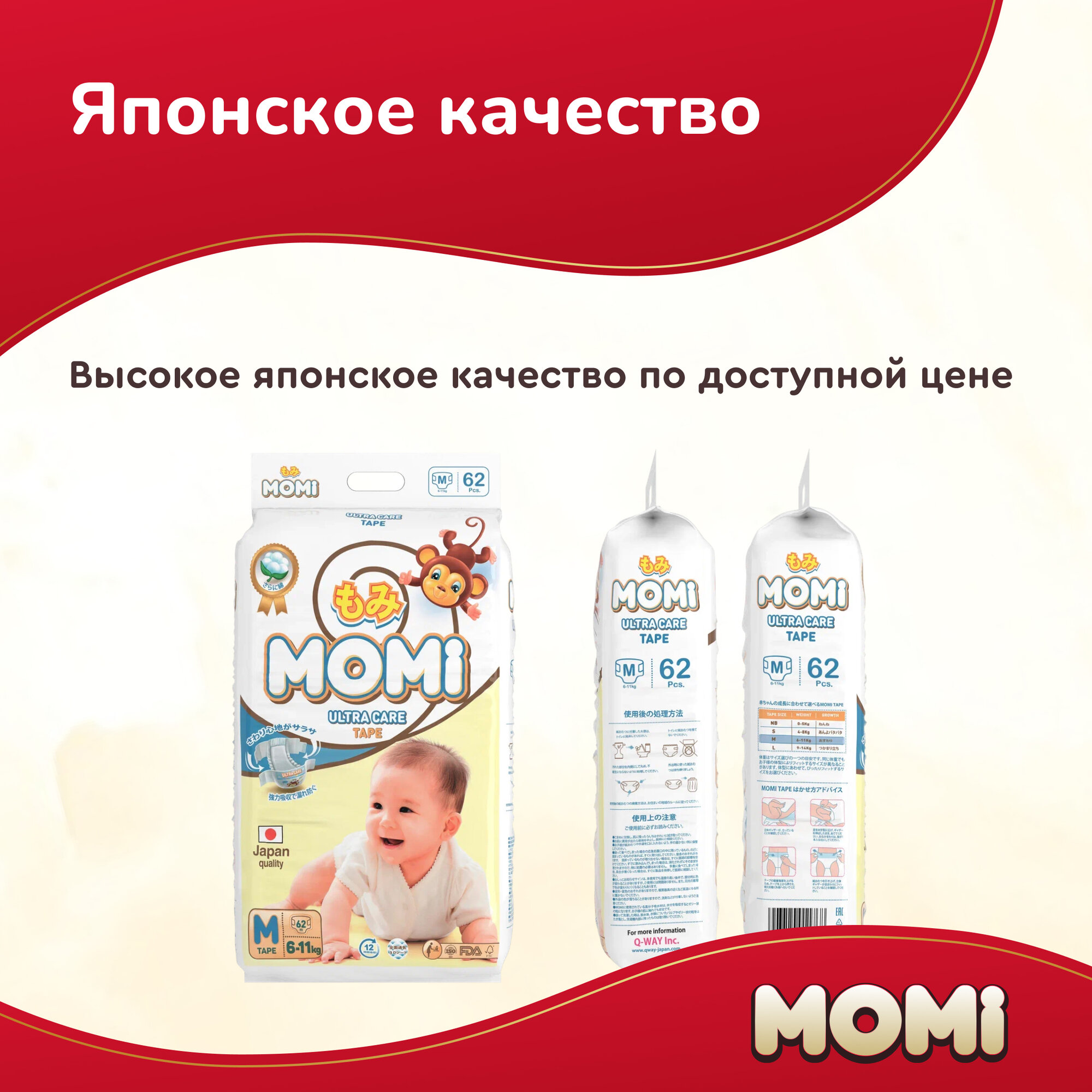 Подгузники MOMI Ultra Care, M (6-11 кг), 62 шт