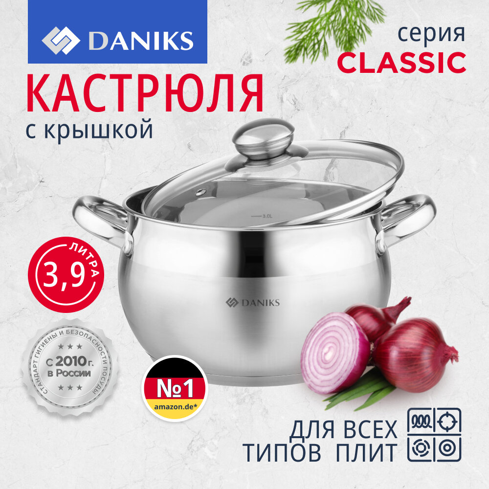 Кастрюля нерж, 3.9 л, с крыш, Daniks, Классика, SD-20, индукц