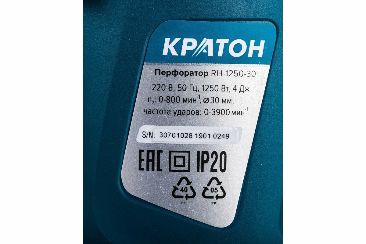 Перфоратор Кратон RH-1250-30 (Кейс, Патрон: SDS-plus; мощность: 1250 Вт Энергия удара: 4 Дж, Электронная регулировка частоты вращения)