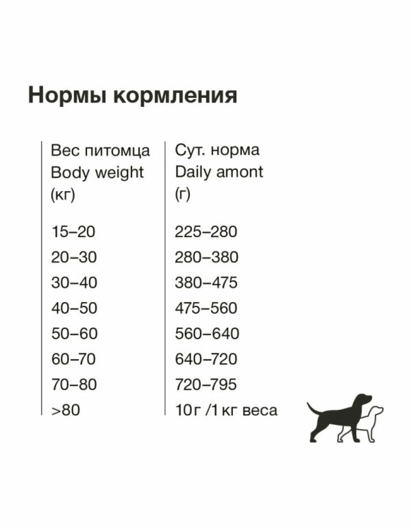| Дозировка | 230-285 г – для собак весом 15-20 кг 285-385 г – для собак весом 20-30 кг 385-475 г – для собак весом 30-40 кг 475-560 г – для собак весом 40-50 кг 560-645 г – для собак весом 50-60 кг 645-725 г – для собак весом 60-70 кг 725-800 г – для собак весом 70-80 кг 10 г на 1 кг массы тела – для собак весом более 80 кг |