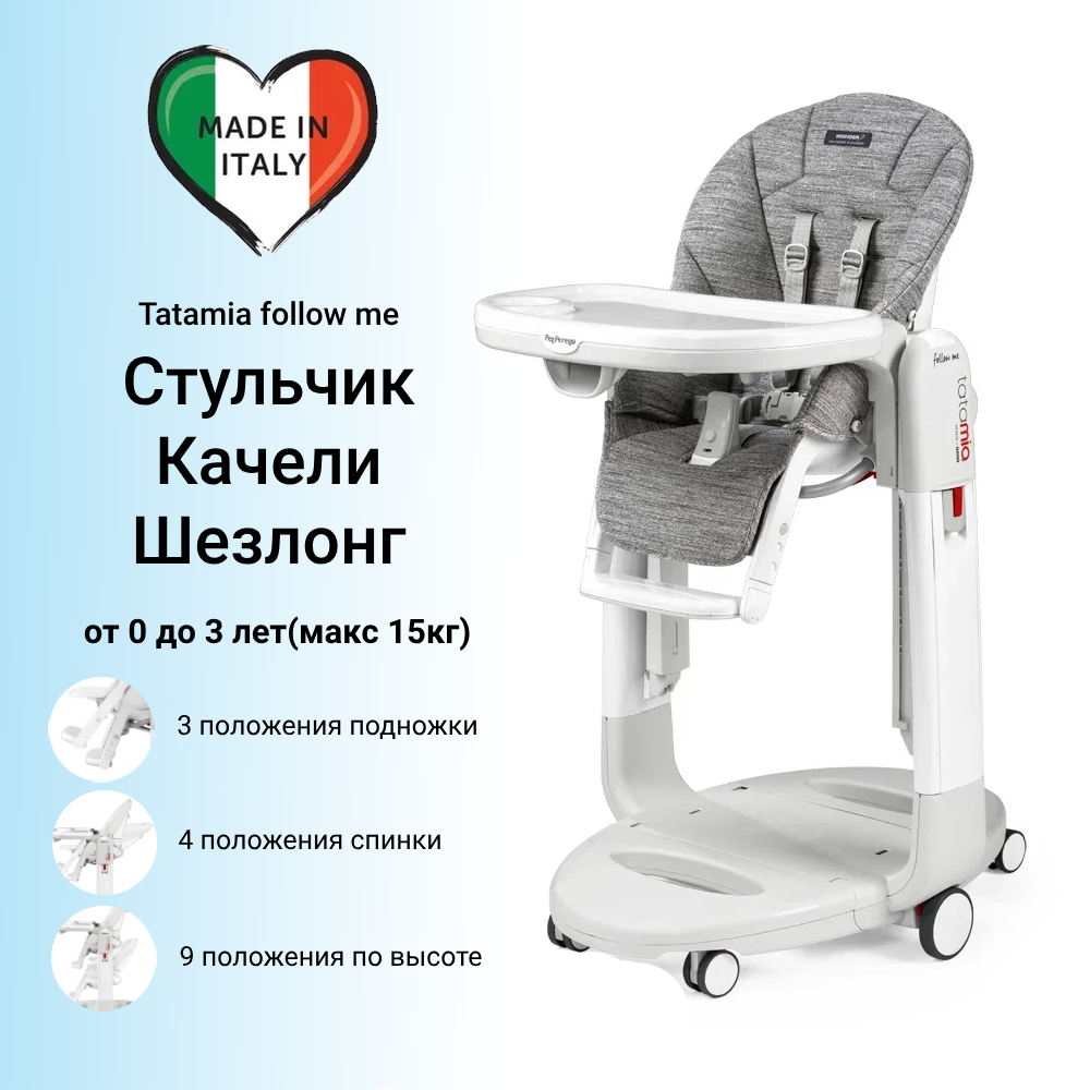 Стульчик для кормления Peg-Perego Tatamia Follow Me на колесах, регулировка спинки, сиденья и подножки, съемный столик, Ice серый New