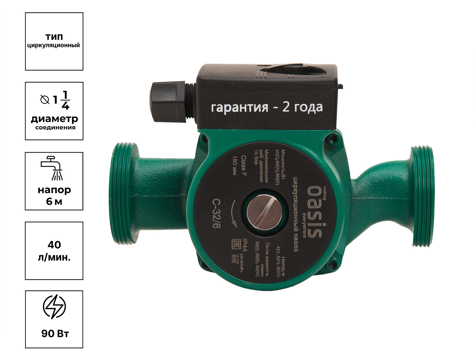 Насос циркуляционный, Oasis, 1 1/4 '', 90 Вт, напор6 м, 2.4 м³/ч, 32/6