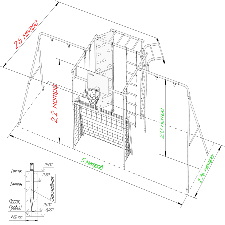 | В комплекте | баскетбольное кольцо, веревочная лестница, ворота, гимнастические кольца, канат, рукоход, скалолазная стенка, турник |