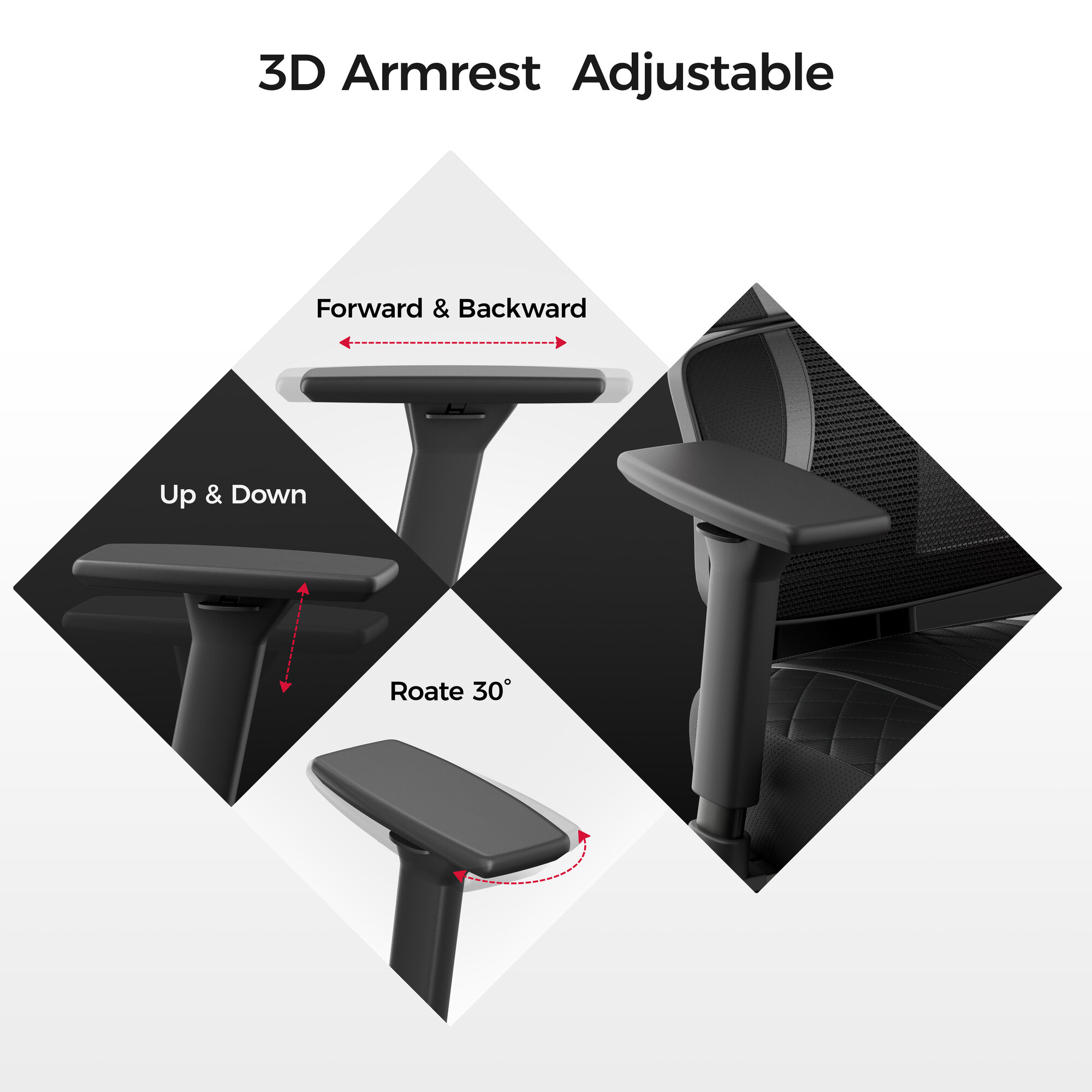 | Регулировка | высоты подголовника / высоты подлокотников / высоты сиденья / высоты спинки / глубины положения подлокотников / глубины сиденья / жесткости качания / наклона спинки / расстояния между правым и левым подлокотником / угла подлокотников |