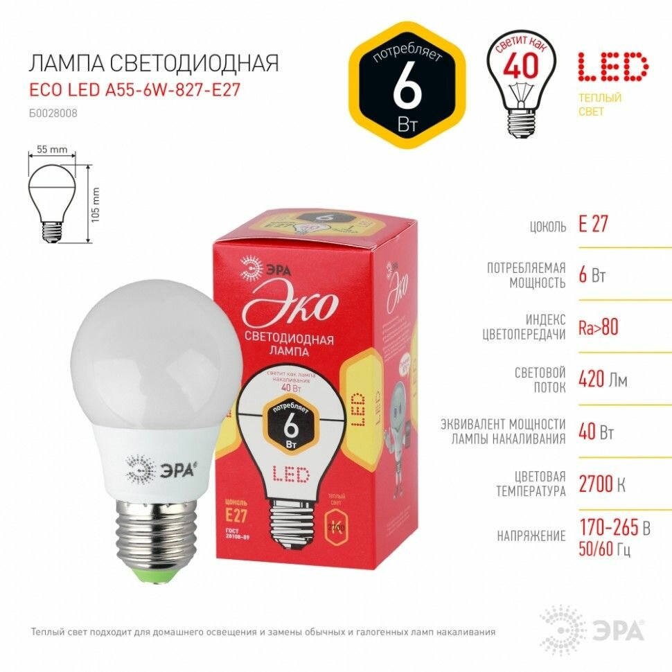 СохранитьЭРА ECO LED A55-6W-827-E27 (диод, груша, 6Вт, тепл, E27) интересное: