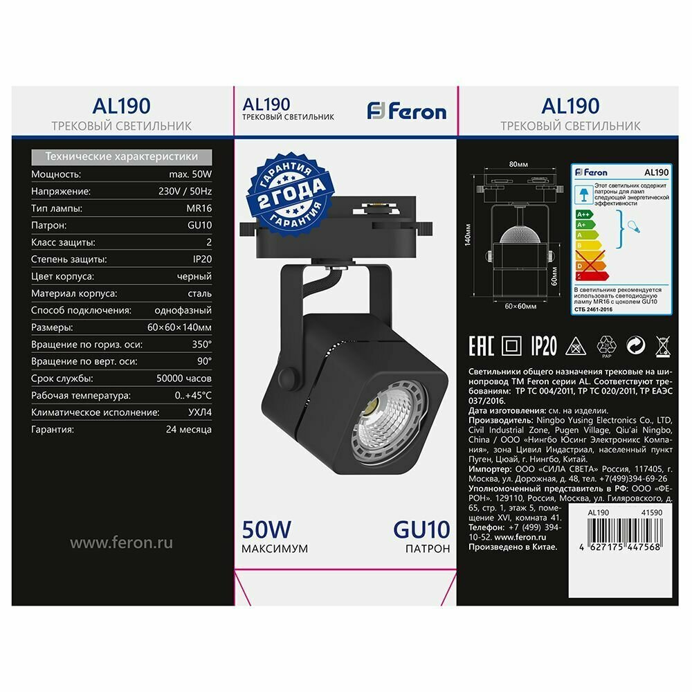 Светильник Feron AL190 трековый однофазный на шинопровод под лампу GU10, черный, 41590