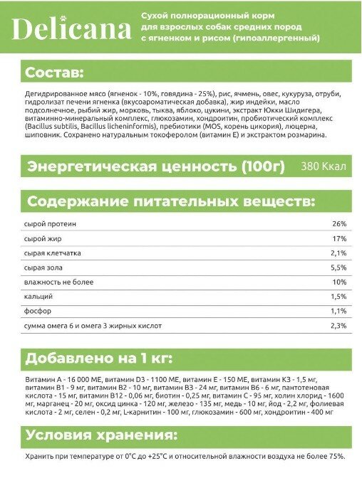 Купить Delicana Сухой корм для собак средних пород с ягненком и рисом 2 кг