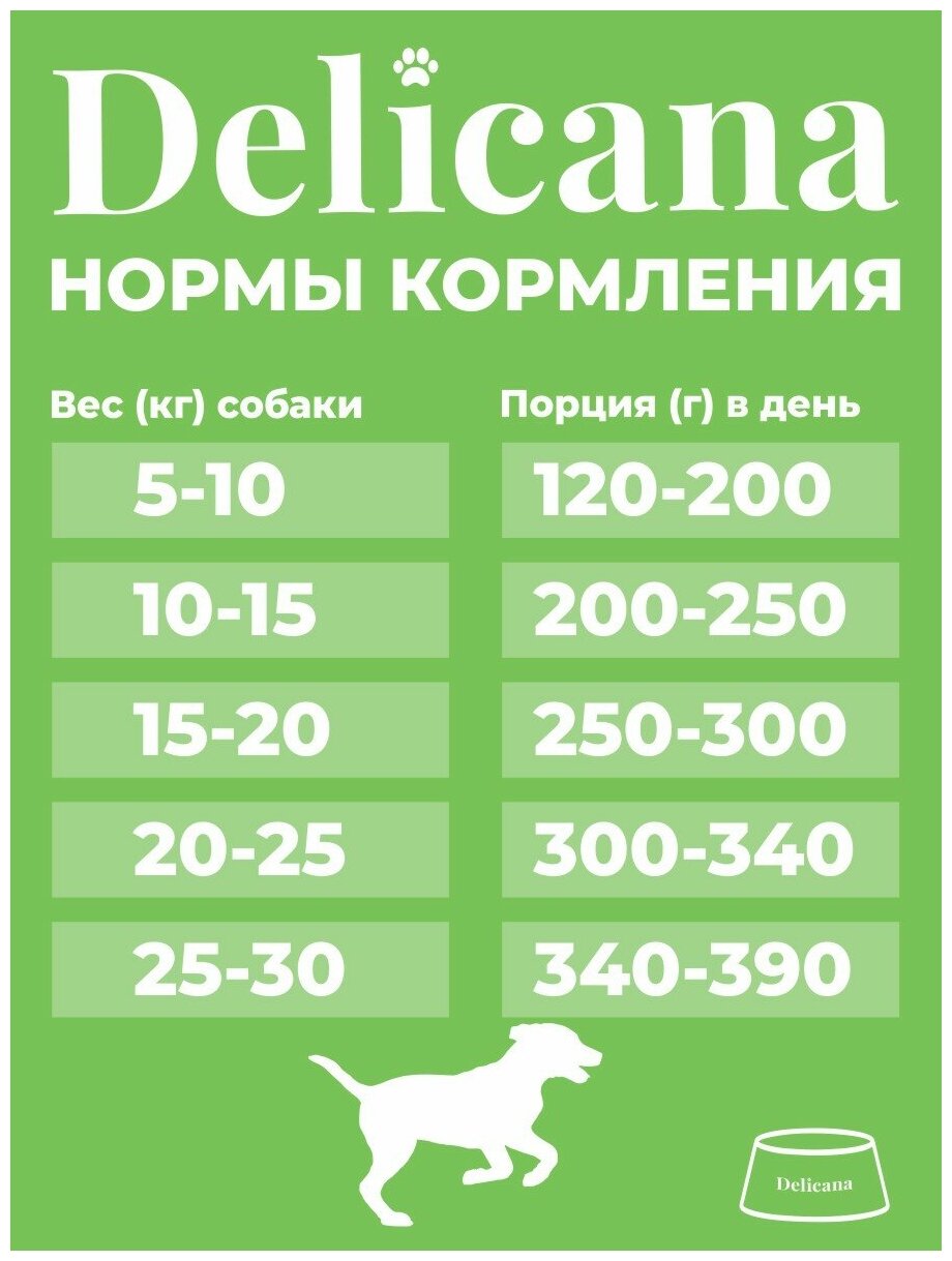 | Дозировка | - вес собаки до 2 кг: 35 г/сут. - вес собаки 2-4 кг: 35-45 г/сут. - вес собаки 4-6 кг: 45-85 г/сут. - вес собаки 6-10 кг: 85-175 г/сут. |