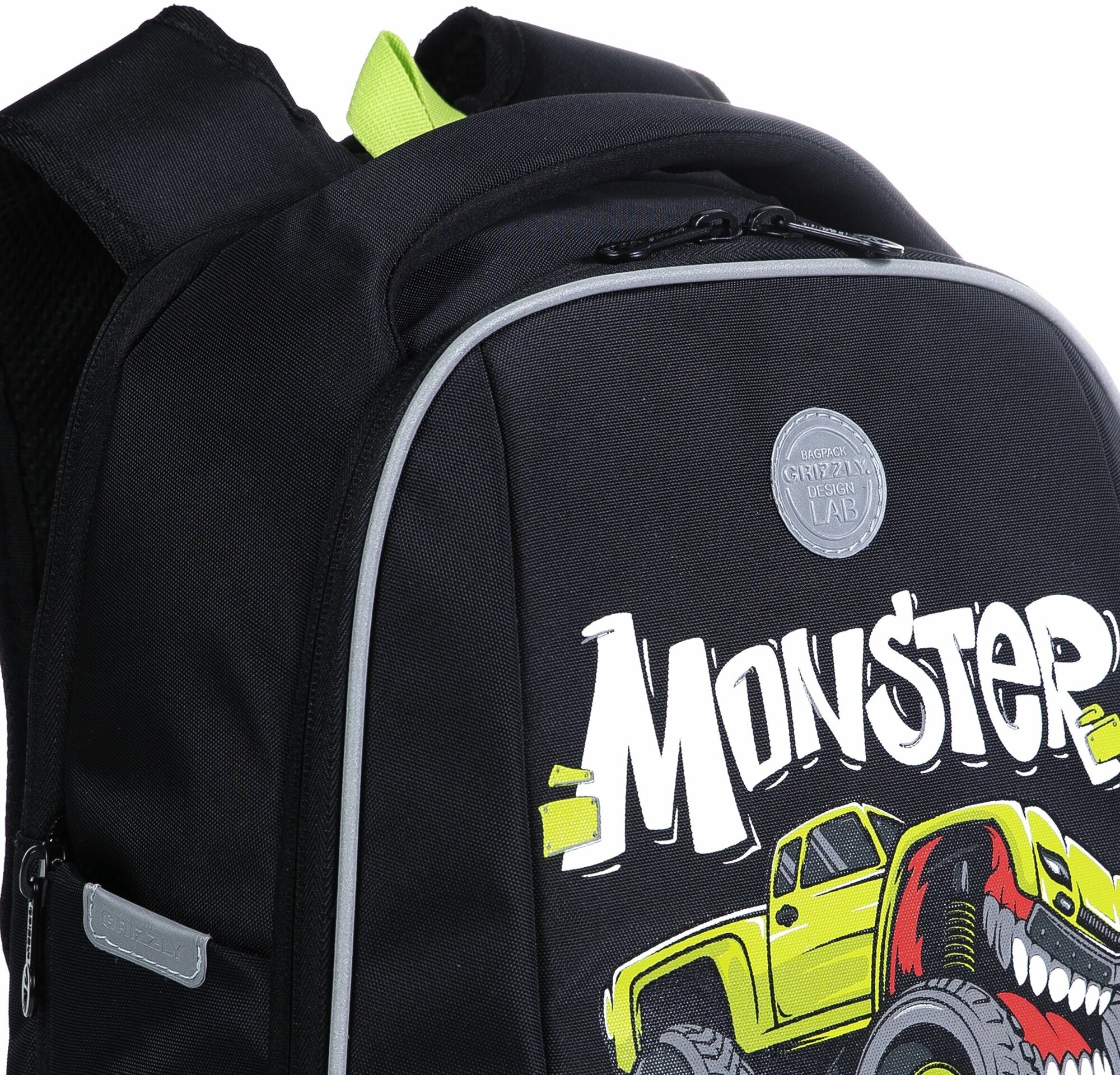Купить Рюкзак школьный с ортопедической спинкой Grizzly RAf-293-2 черный - салатовый, на ножках, вес 970грамм, 2 отделения, 36x29x18см