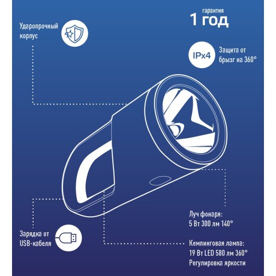 | Дополнительная информация | переключение между режимом фонаря и светильника; тип аккумулятора: Li-ion |