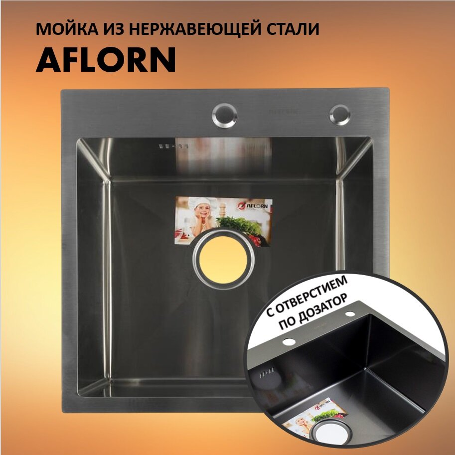 Мойка кухонная врезная AFLORN 50х50 графит, из нержавеющей стали, с сифоном, с дозатором в цвет мойки