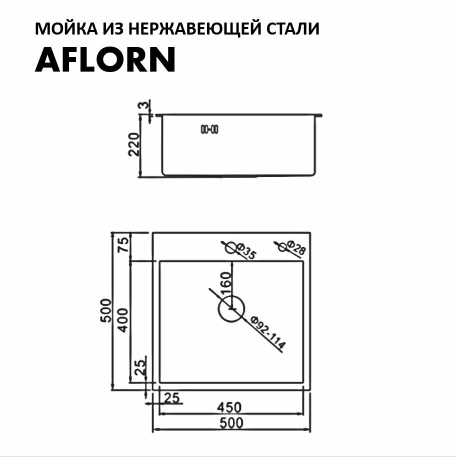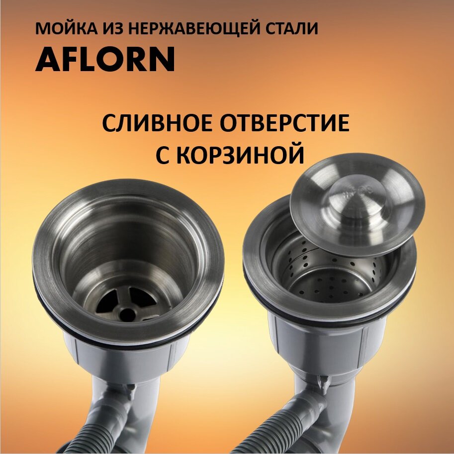 AFLORN Мойка врезная нерж. 50х50 AFLORN, толщина 3,0 мм, покрытие Сатин, с сифоном