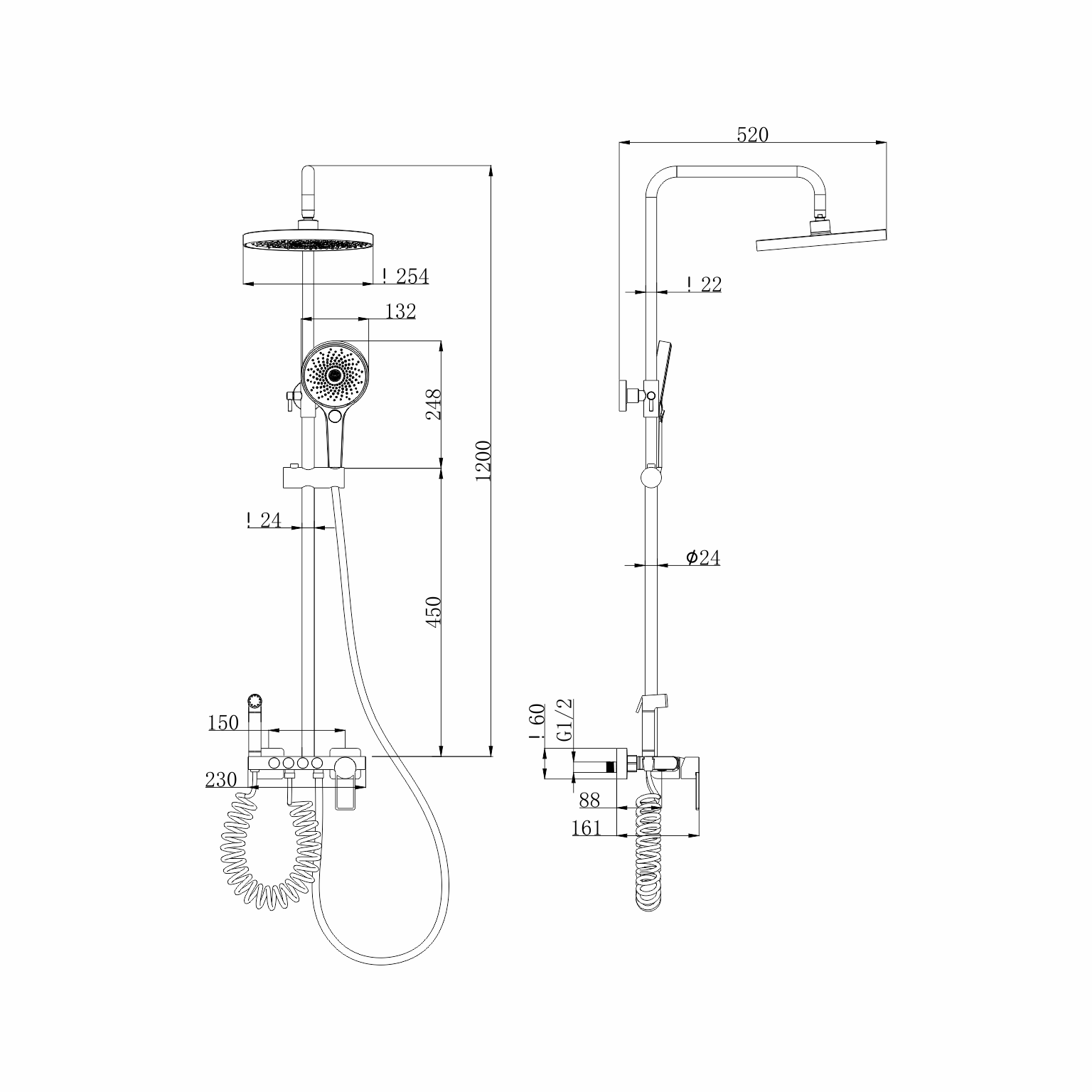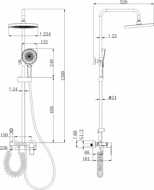 | Комплектация | Душевая стойка ,смеситель / установочный комплект / штанга / верхняя лейка / ручная лейка / шланг |