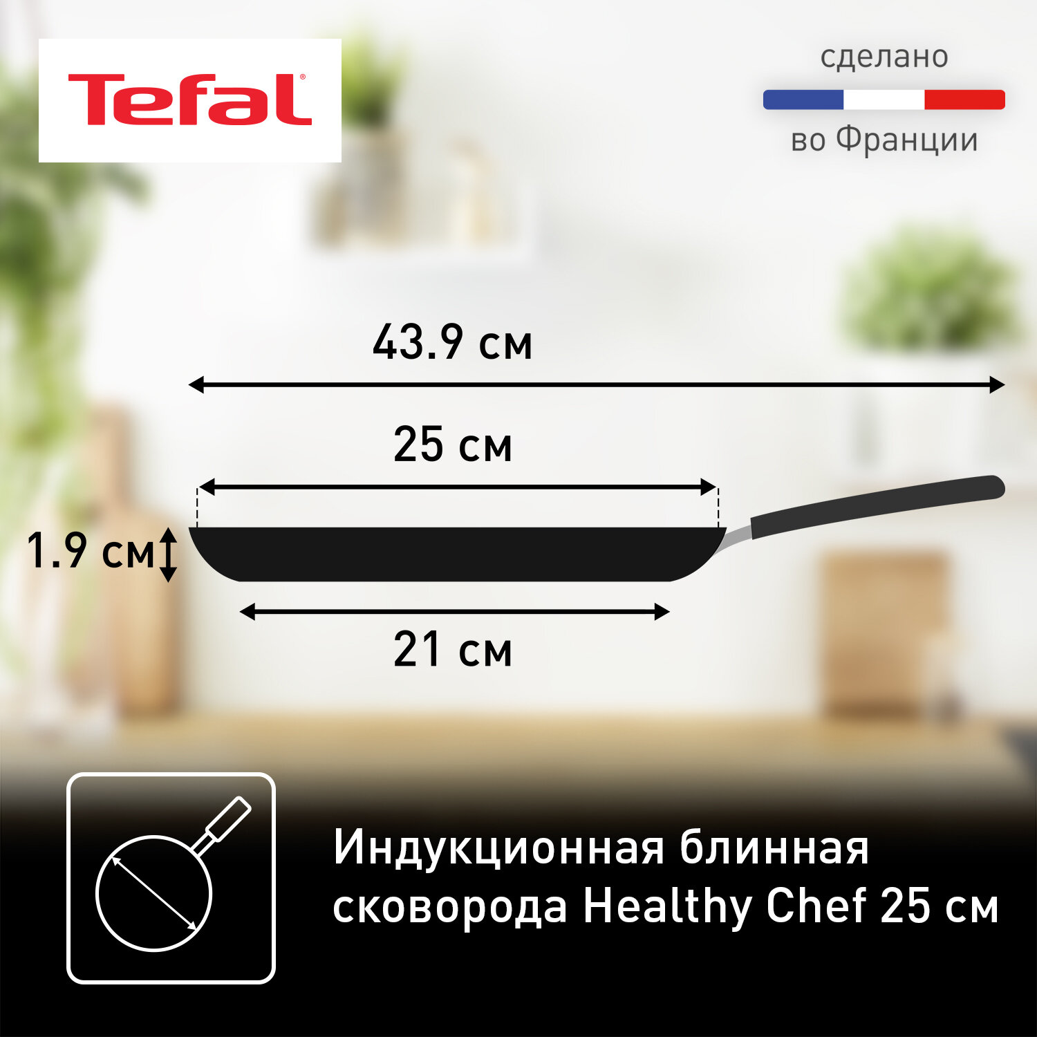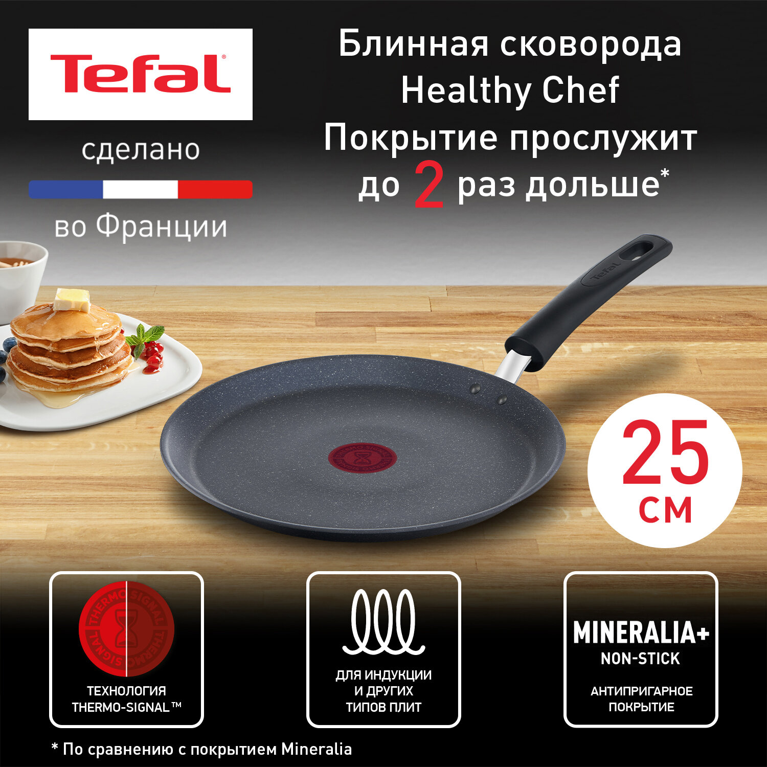 Блинная сковорода Tefal Healthy Chef G1503872, 25 см, с антипригарным покрытием, подходит для индукции, сделано во Франции