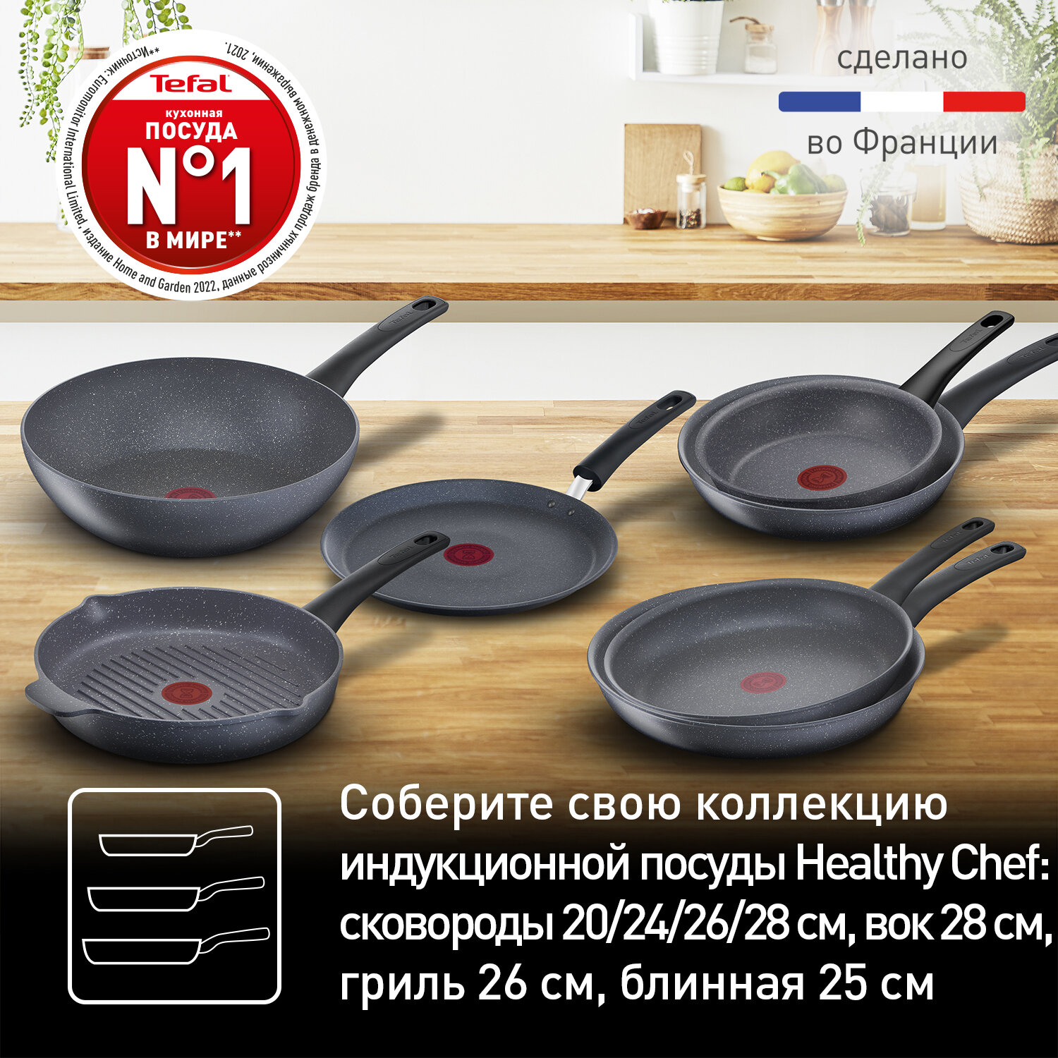 Блинная сковорода Tefal Healthy Chef G1503872, диаметр 25 см, с индикатором температуры, с антипригарным покрытием, для газовых, электрических и индукционных плит, сделано во Франции