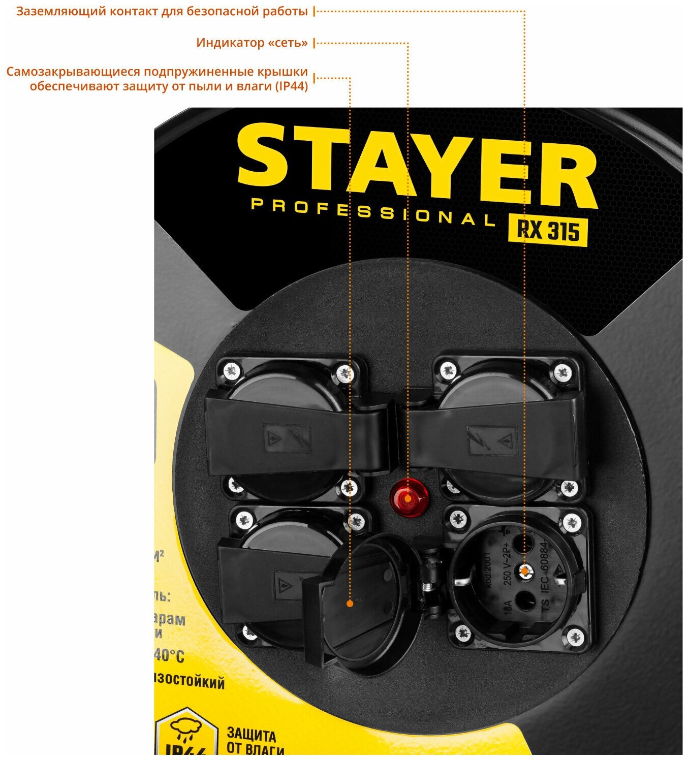 Удлинитель на катушке RX 315, 30 м, 3700 Вт, 4 гнезда, IP44, КГ 3х1,5 кв мм, STAYER(55077-30)