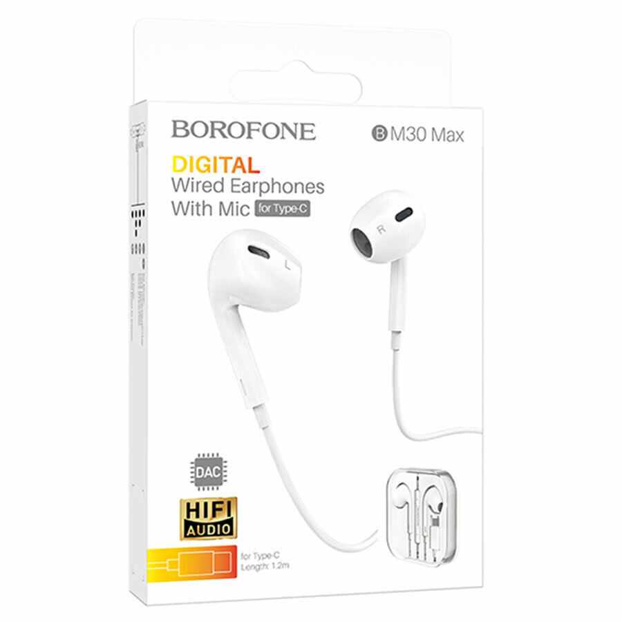 Наушники внутриканальные Borofone BM30, Max, пластик, микрофон, кнопка ответа, регулятор громкости, кабель Type-C, 1.2м, цвет: белый