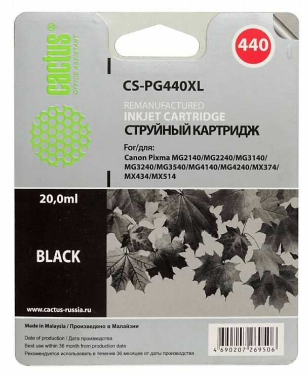 Картридж Cactus CS-PG440XL, совместимый, черный, 600 страниц, для Canon PIXMA-MG2140 / MG2240 / MG3140 / MG3240 / MG3540 / MG3640 / MG4140 / MG4240 / MX374 / MX394 / MX434 / MX454 / MX474 / MX514 / MX524 / MX534