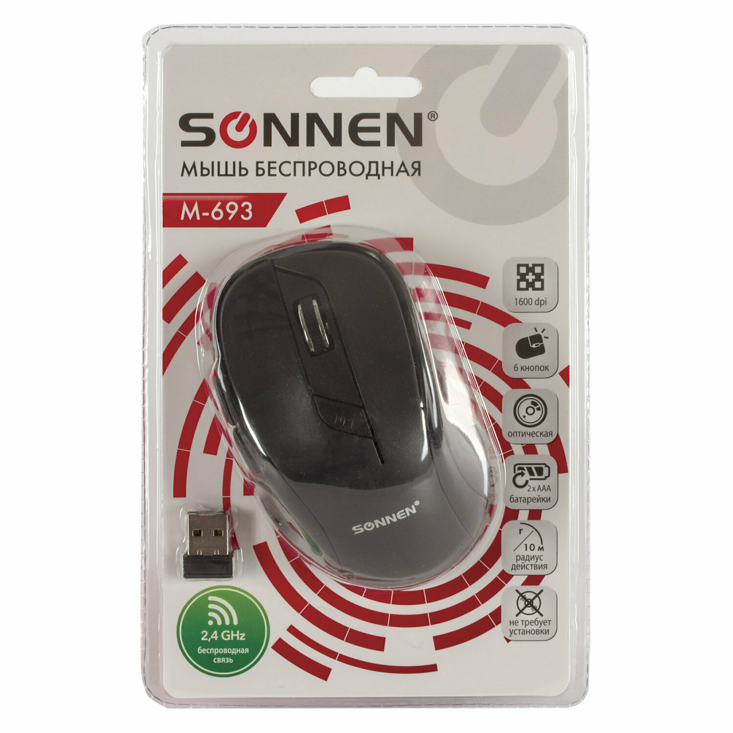 Мышь беспроводная SONNEN M-693, USB, 1600 dpi, 5 кнопок + 1 колесо-кнопка, оптическая, черная