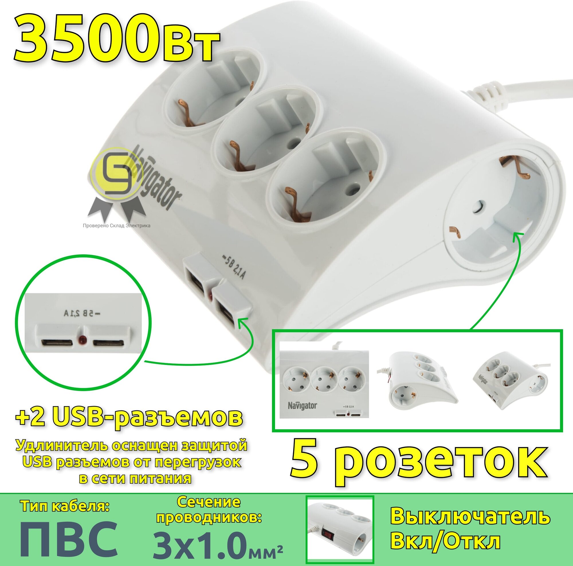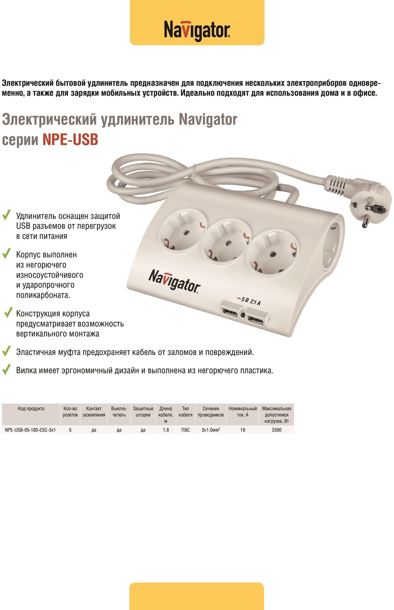 Удлинитель бытовой 5 гнезд, 1.8 м, USB разъем, Navigator, NPE-USB-05-180-ESC-3X1, 71544 интересное: