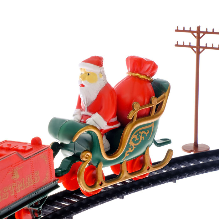 | Подробная комплектация | паровоз, грузовой вагон, сани с Дедом Морозом, опоры линии электропередач, деревья, остановочный комплекс, конверт с письмом от Деда Мороза |