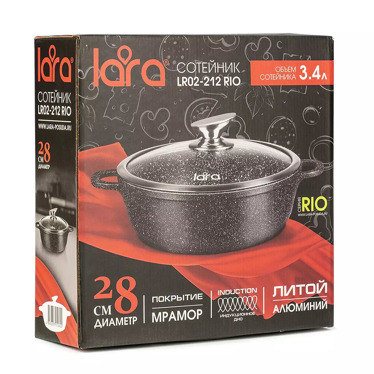LR02-212 Сотейник LARA серия Rio 28см, 3.4л, мрамор, капсулированное индукционное дно, крышка