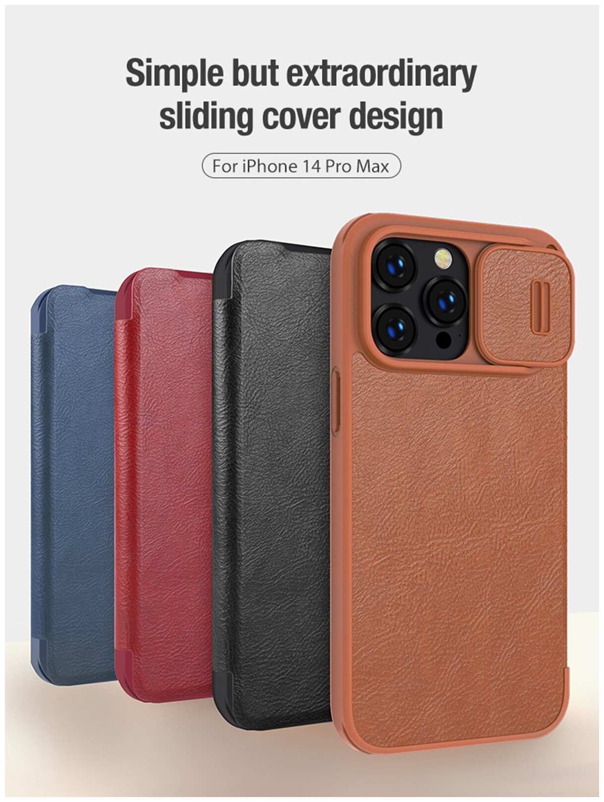Купить Кожаный чехол-книжка Nillkin Leather Qin Pro c защитой камеры для iPhone 14 Pro Max коричневый