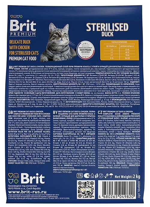 Brit Premium Cat Sterilised сухой корм для взрослых стерилизованных кошек с уткой и курицей - 8 кг интересное: