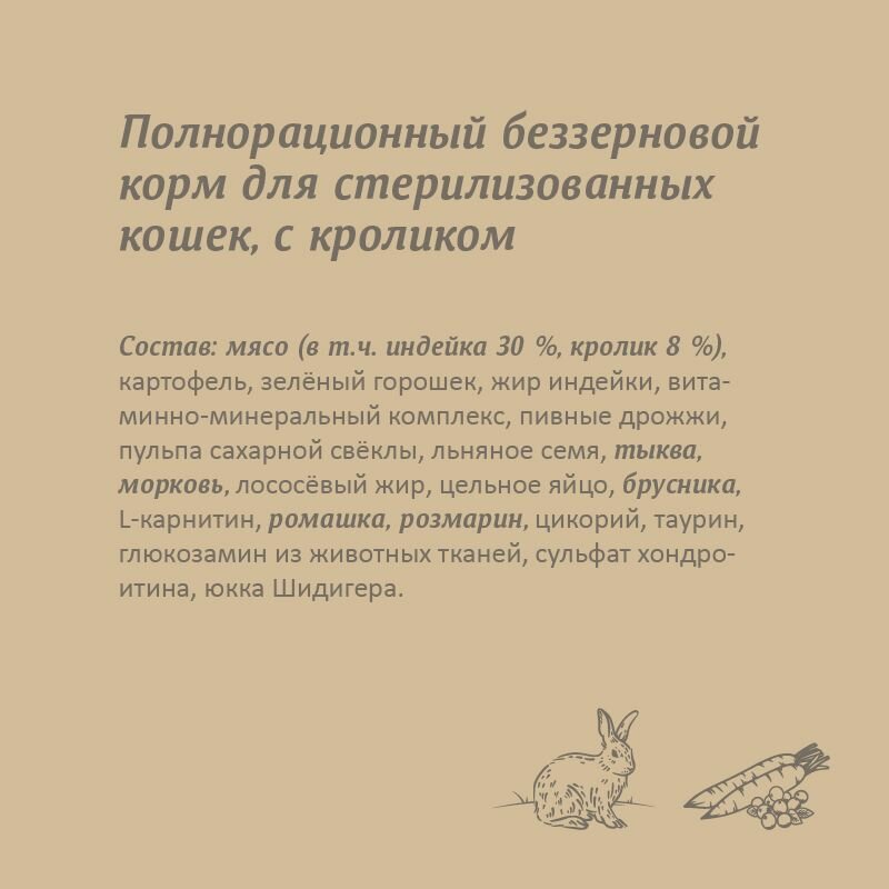 | Состав | мясо (в т.ч. индейка 30 %, кролик 8 %), картофель, зелёный горошек, жир индейки, витаминно-минеральный комплекс, пивные дрожжи ,цельное яйцо, пульпа сахарной свёклы, льняное семя, тыква, морковь , лососёвый жир,брусника, L-карнитин, ромашка, розмарин, цикорий, таурин, глюкозамин из животных тканей, сульфат хондроитина, юкка Шидигера |