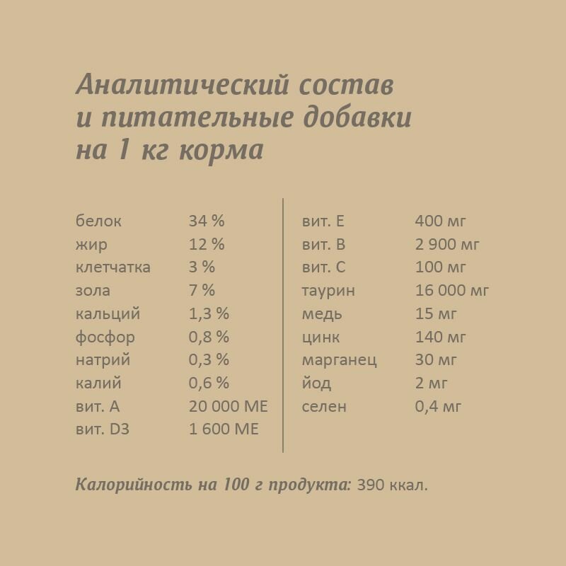 А также высокое содержание витамина А: 20000 МЕ. И витамина D: 1600 МЕ. Остальные ингредиенты тоже натуральные. Кошкам (18 лет и 4 года) очень понравился запах. Едят с удовольствием. Я его даю в смеси с другими кормами: делаю ассорти |