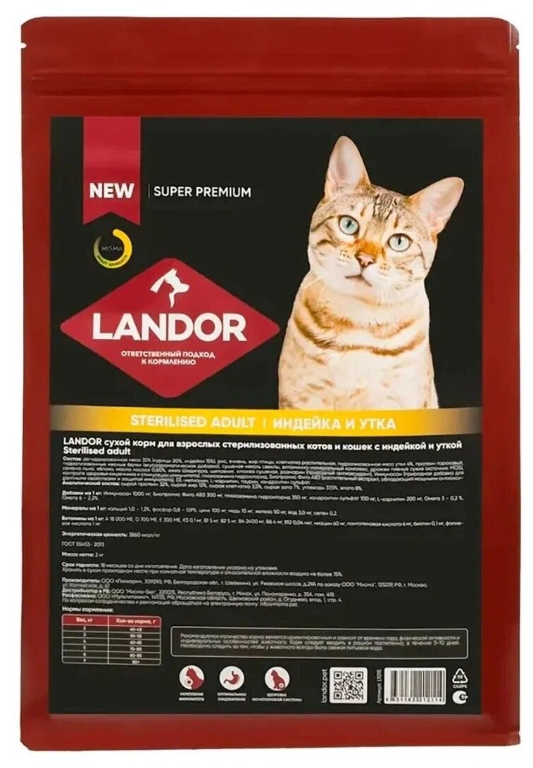 LANDOR Полнорационный сухой корм для стерилизованных котов и кошек с индейкой и уткой 400г интересное: