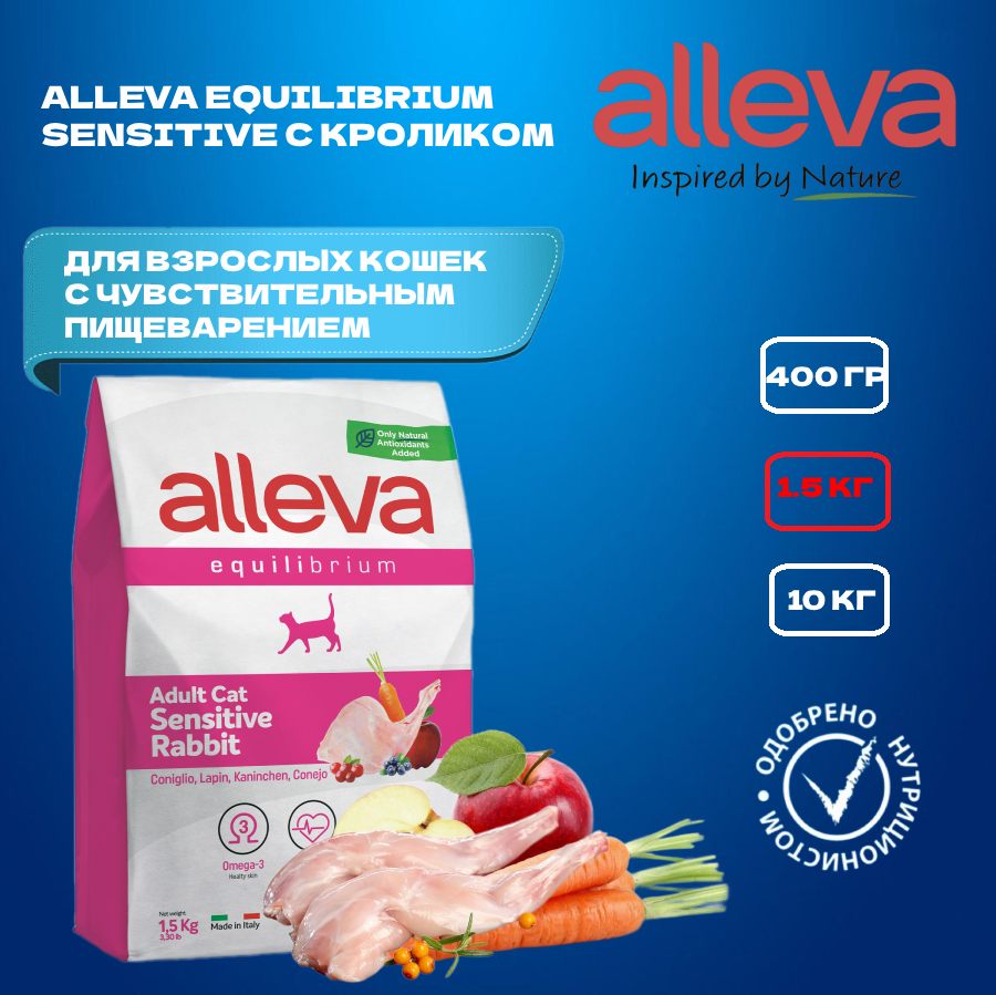 Сухой корм ALLEVA EQUILIBRIUM SENSITIVE RABBIT ADULT CAT, для взрослых кошек с чувствительным пищеварением, с кроликом, 1,5 кг