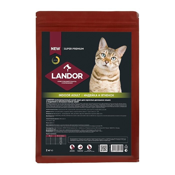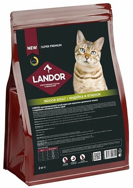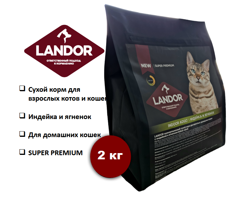 LANDOR CAT ADULT INDOOR для взрослых кошек живущих дома с индейкой и ягненком (2 кг)